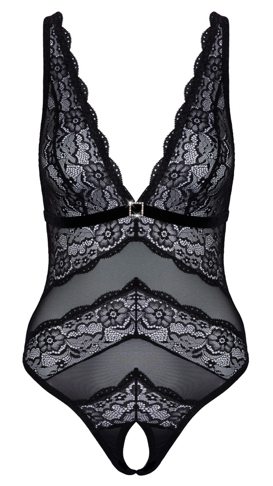 Discover elegance combined with exceptional comfort in the Cottelli Lingerie Lace Bodysuit, size S. Crafted from a refined blend of powernet and floral lace, this model delivers a sophisticated look enhanced by thoughtfully designed details. The deep neckline visually elongates the silhouette, while the luxurious velvet underbust band is accented with a sparkling rhinestone element, adding a touch of subtle glamour.