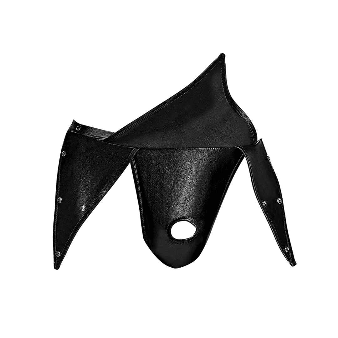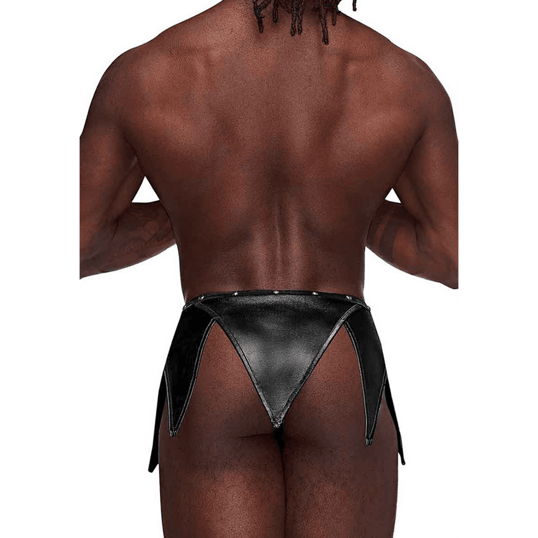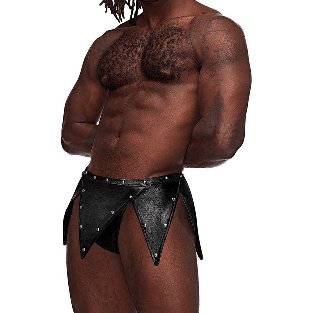 From the Fetish collection by Male Power, this style includes: A gladiator inspired kilt design featuring an attached thong with a cutout peephole, triangle flaps and decorative metal studs.