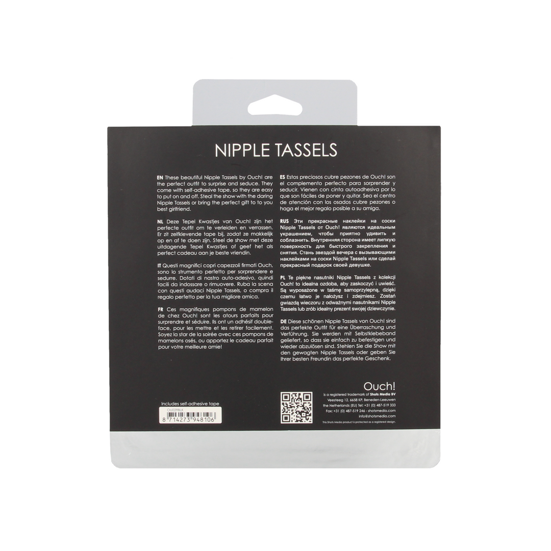 These beautiful Nipple Tassels by Ouch! are the perfect outfit to surprise and seduce. They come with self-adhesive tape, so they are easy to put on and off. Steal the show with the daring Nipple Tassels or bring the perfect gift to to you best girlfriend.