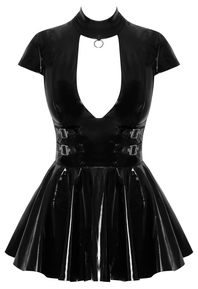 Black Level Vinyl Mini Dress S with Decorative Front Ring, Shiny Finish
