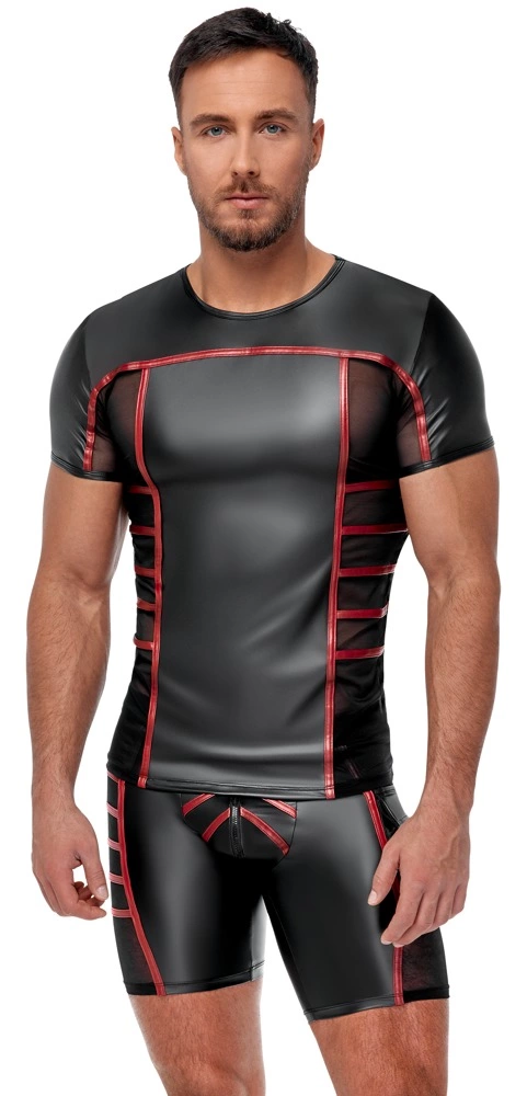 This close-fitting shirt stands out with its unique combination of premium matte black fabric and striking red accent stripes, delivering a bold, contemporary appearance. The innovative design features transparent mesh panels along the sides and underarms, enhancing breathability and visual appeal. Crafted from soft, stretchy materials, this shirt ensures all-day comfort and freedom of movement.